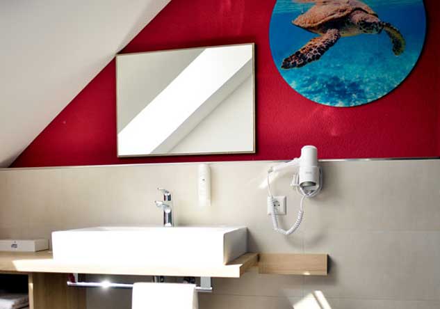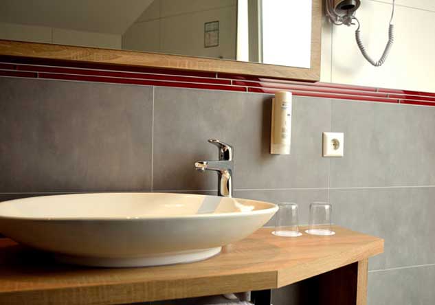 eigenes Badezimmer mit Dusche, Haartrockner und kostenfreien Pflegeprodukten. Die Zimmer zum Fluss haben alle bodentiefe Fenster. Wir legen großen Wert