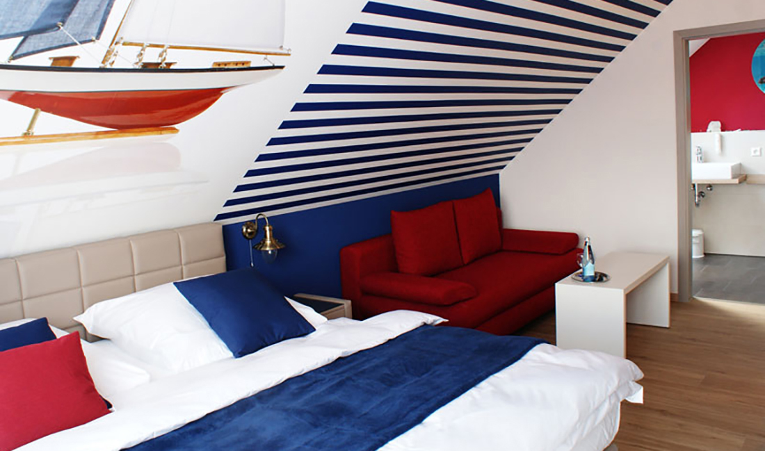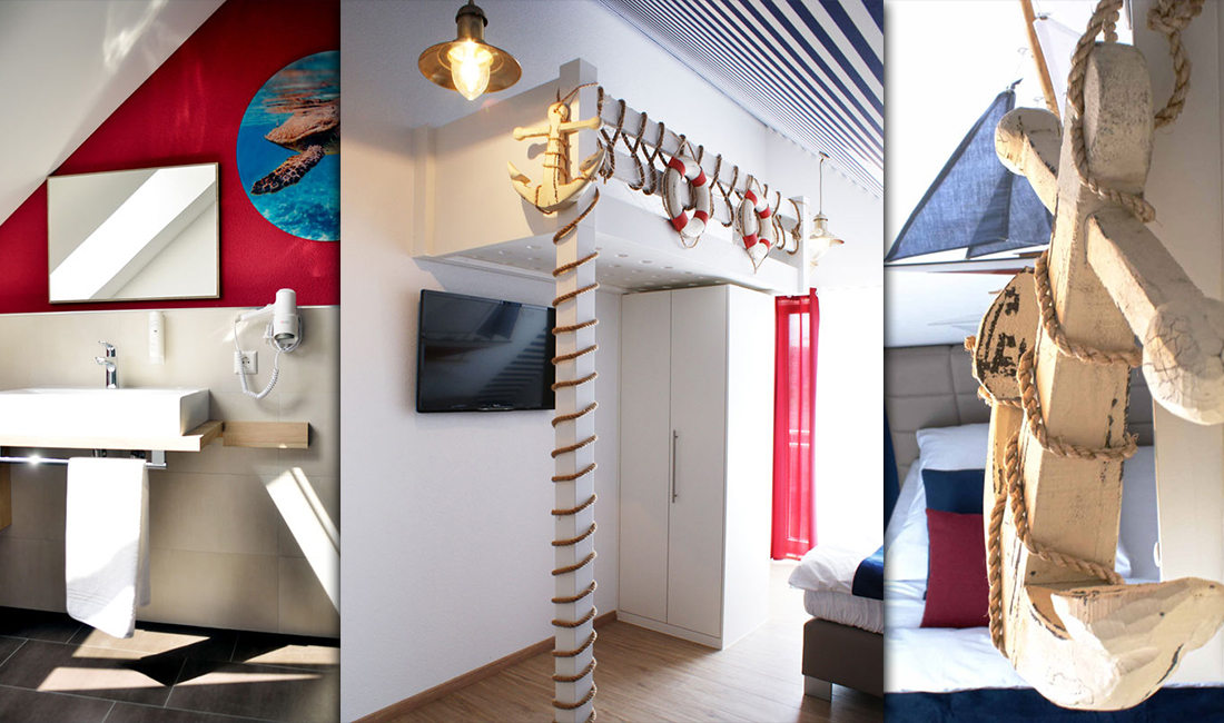 Das etwa 22 qm große Friends & Family Superior Zimmer verfügt über ein Doppelbett und einem Hochbett für zwei Personen. Ideal für vier Erwachsene oder zwei Erwachsene mit zwei Kindern. Eine gemütliche Sitzecke mit großem Smart-TV lädt zum Entspannen ein.